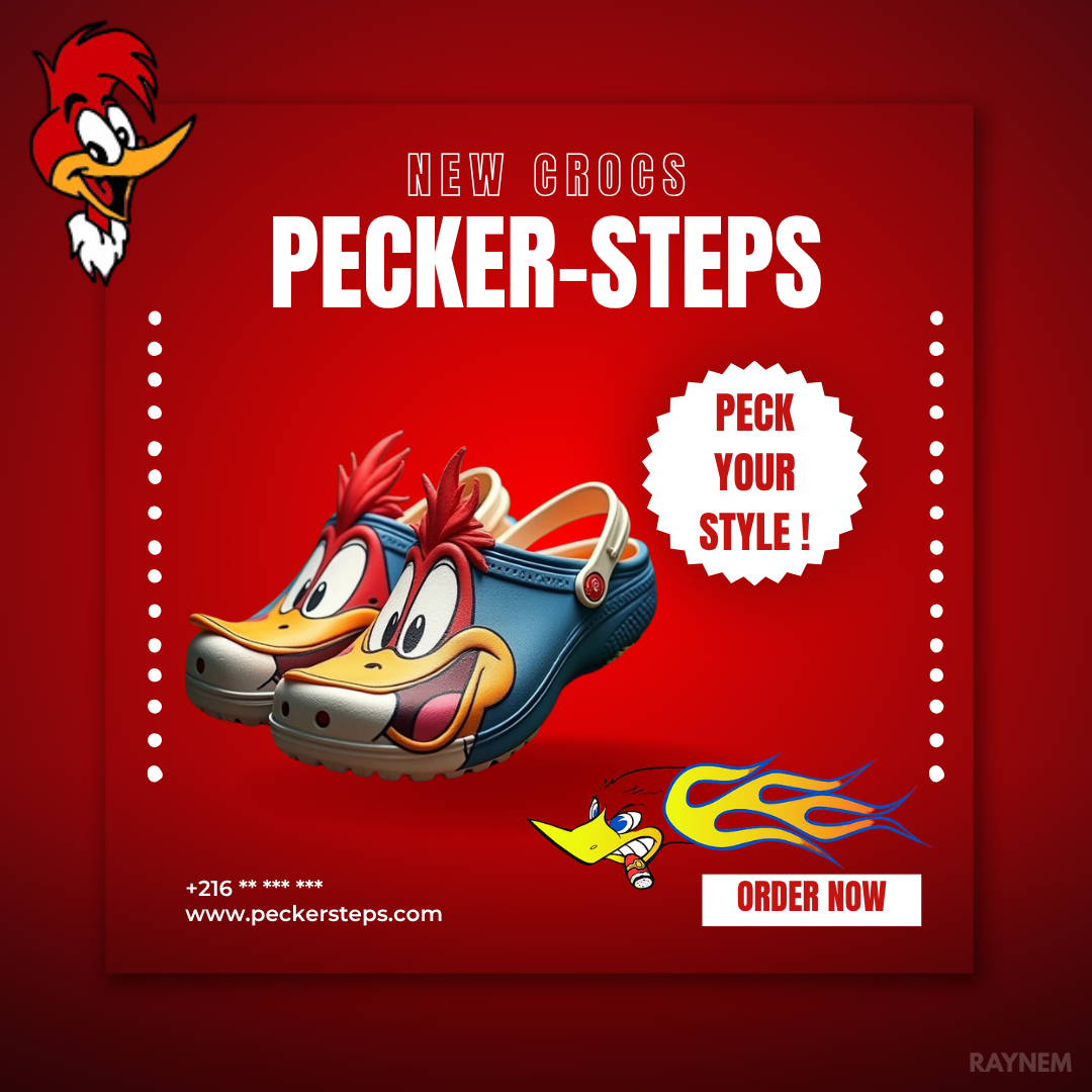 Pecker Steps Crocs , a playful woodpecker themed design with clean shapes and bright colors. It’s inspired by nature and made to look fun, bold, and different from regular Crocs.